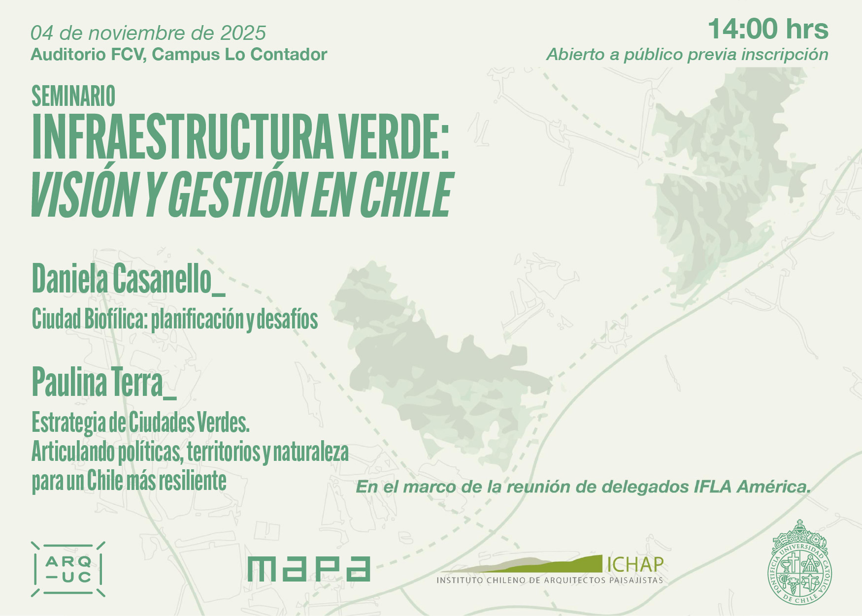 El Magister en Arquitectura del Paisaje (MAPA) UC junto al Instituto Chileno de Arquitectos Paisajistas (ICHAP) invitan al seminario "Infraestructura Verde: Visión y gestión en Chile", en el marco de ...