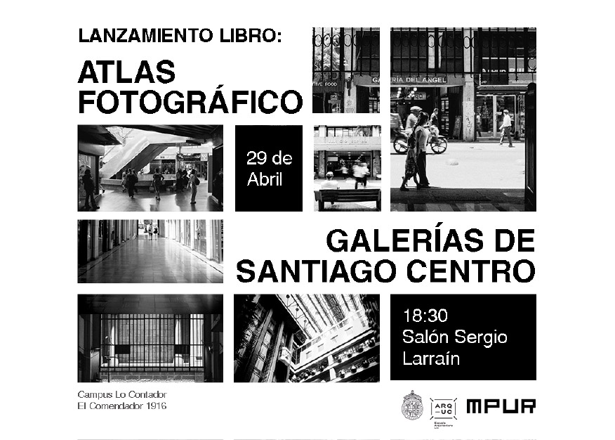 El Magíster en Proyecto Urbano UC (MPUR) invita al lanzamiento del libro "Atlas fotográfico Galerías Comerciales de Santiago Centro", proyecto realizado por los estudiantes Gabriel Sánchez y Martín Co...