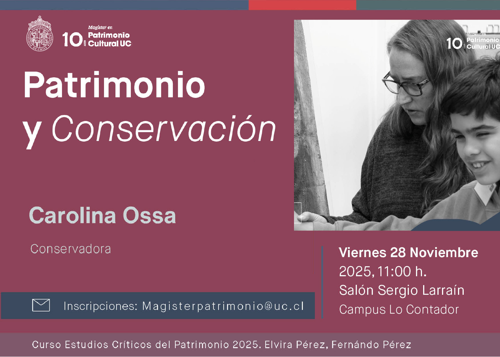 El Magíster en Patrimonio Cultural UC (MAPC) invita a la clase abierta "Patrimonio y Conservación", a cargo de la conservadora restauradora Carolina Ossa.