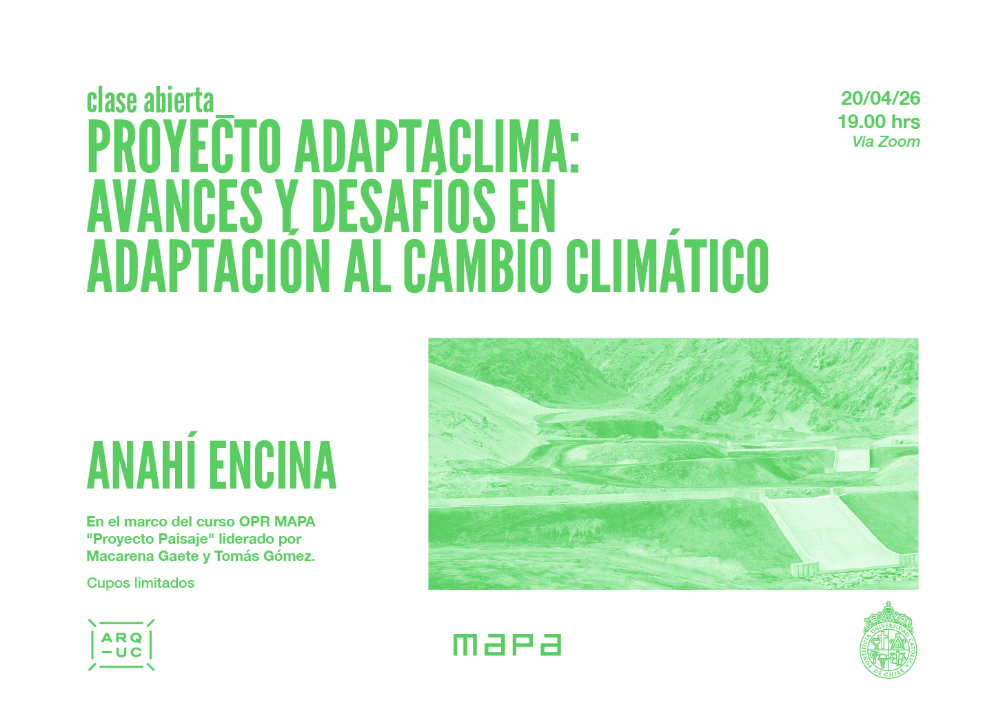 El Magíster en Arquitectura del Paisaje UC (MAPA) invita a la clase abierta "Proyecto AdaptaClima: Avances y Desafíos en Adaptación al Cambio Climático”, que dictará Anahí Encina, coordinadora del pro...