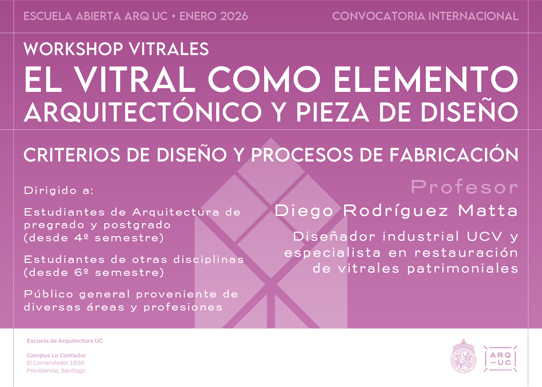 La Escuela de Arquitectura UC invita a estudiantes y público general, provenientes de diversas disciplinas, a participar en el workshop de verano “El vitral como elemento arquitectónico y pieza de dis...