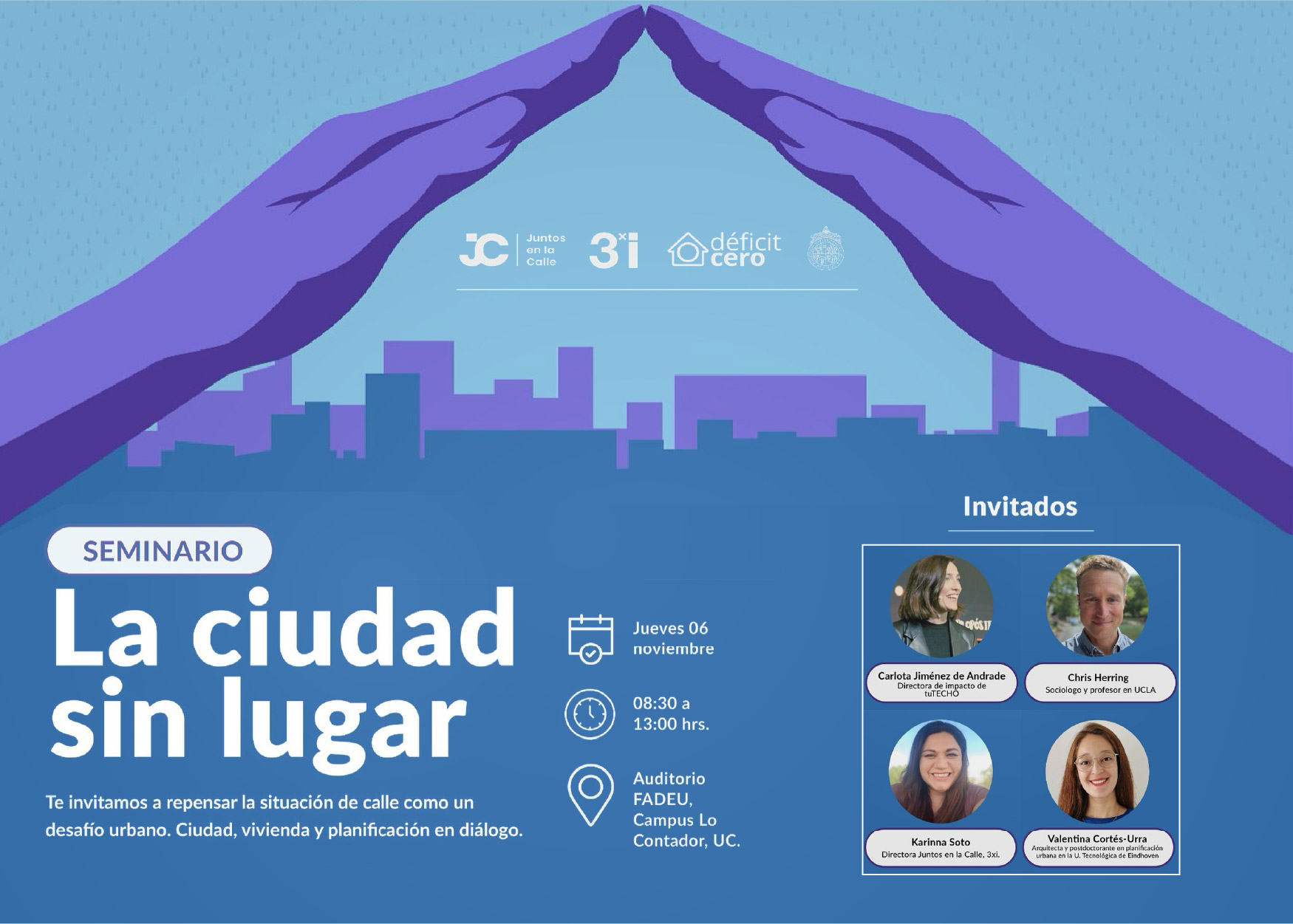 La Facultad de Arquitectura, Diseño y Estudios Urbanos UC invita al seminario "La ciudad sin lugar", organizado en conjunto por Déficit Cero, Juntos en la Calle, 3xi y la Escuela de Arquitectura ...