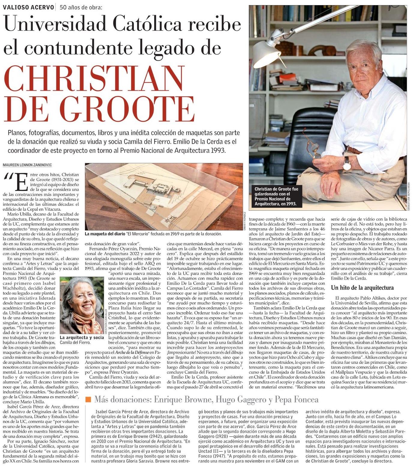 Las conversaciones entre la Escuela de Arquitectura UC y Camila Del Fierro comenzaron en 2014, con miras a evaluar el destino del valioso acervo patrimonial del arquitecto UC y Premio Nacional de Arquitectura 1993, Christian De Groote, material que quedó resguardado por su oficina. Tras retomar el diálogo a fines de 2021, finalmente se concretó el traslado de este fondo documental al Archivo de Originales FADEU UC, siguiendo la voluntad expresa del arquitecto.